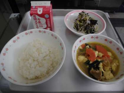 麦ごはん 牛乳 とうふのカレー煮 ほうれん草ともやしのいためナムル
