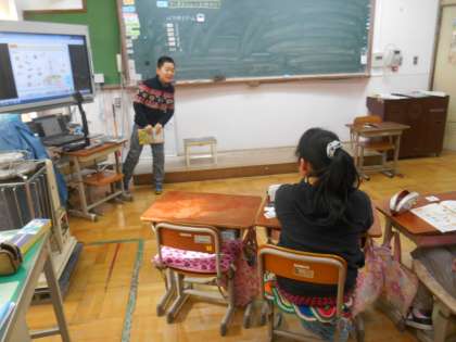 自分の好きなメニューを考えて、みんなに伝える活動をしていました。自分で考えたメニューを紹介するというタスクに向かって、単語を言う練習をしたこと、紹介するときの表現法を身に付けたことをもとに、自分の好きなメニューを紹介していました。きれいなメニューの絵があり、操作さしやすい状況が有り、児童は自然に、みんなに伝えたいという気持ちで臨みました。聞く方も、この人はどんなメニューを選ぶのか興味を持って聞くことができ、良いコミュニケーションが取れたと思います。