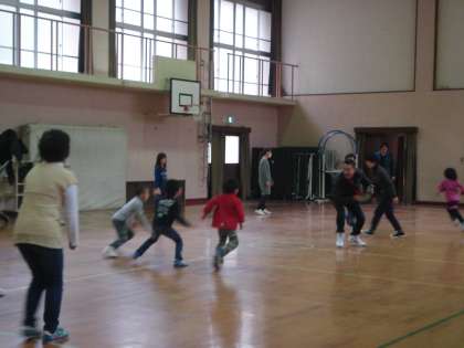おいしい昼食の後は、恒例のドッジビー大会です。子ども、保護者、教職員が一緒にドッジビーを行いました。4チームに分かれて、子どもも大人も大はしゃぎのひと時でした。