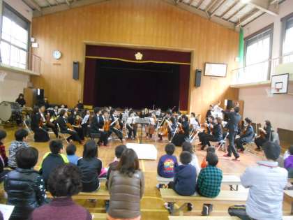 神山交響楽団の皆さんに来ていただき、楽しく音楽にふれる時間をすごしました。楽器紹介、楽器の音色から楽器を当てるクイズ、楽器ごとのアンサンブル演奏、全体での演奏など楽しくあっという間の時間でした。