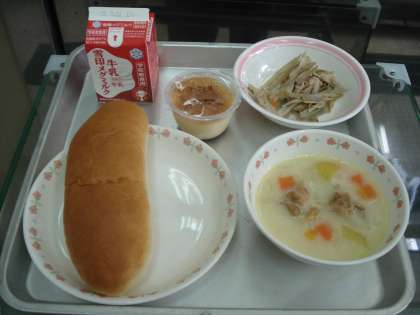 味付けコッペパン 牛乳 じゃがいものクリームシチュー ごぼうのソテー プリン