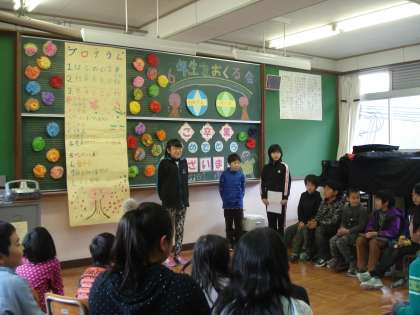 とっても楽しい雰囲気の部屋で6年生を送る会がスタートしました。6年生も、他の学年の子どもたちも、みんなとびっきりの笑顔です。