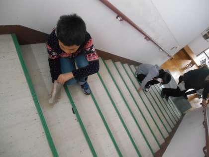 在校生が、一生懸命、湿気で濡れてすべりやすくなっている階段を拭いて卒業式に向けて校舎をきれいにしていました。