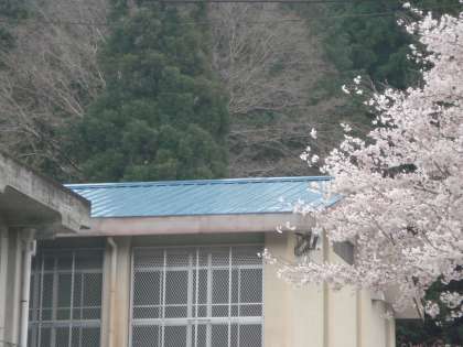 ここ数日、あいにくの雨模様ですが、静原小学校の桜は散らずに入学式を待っています。明日は満開の桜の中を新入生が来てくれることでしょう。お色直しを終えた体育館の屋根のブルーに桜のピンクがよく映えています。