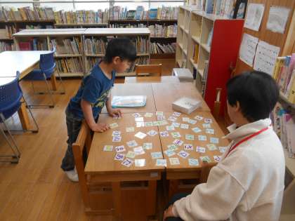 プリントだけでなく、カードを使って学習をしていました。ひらがな、「あいうえお」の順番も意識しての学習です。順番に並べられるようにカードを探して並べていきます。声にも出して文字の読みの確認をしていました。