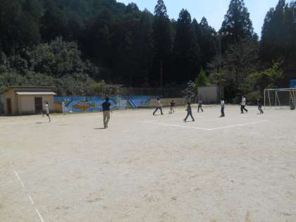 中間休み、みんなでサッカー。今日もいい天気です。