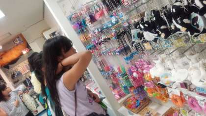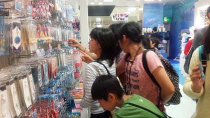 名古屋港水族館でのお買い物です。かわいいグッズがいっぱいでみんなとても楽しそうです。