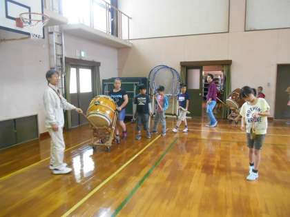 5月3日に静原神社の春祭りが行われます。子どもたちは、子ども神輿を引っ張ったり、御幸持ちをしたり、太鼓をたたいたりといういろいろな形で、お祭りに参加します。太鼓をたたきながら町内を練り歩きます。その練習も大詰めとなりました。