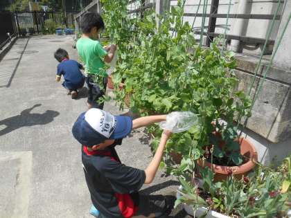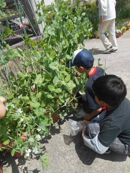 スナップエンドウの収穫をしませんかという掲示を見つけると、楽しみにしていたかのように、わくわくした雰囲気で、作業をしに来ました。