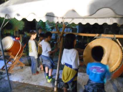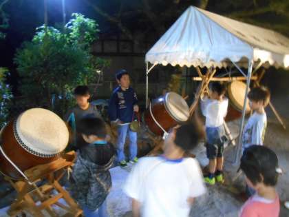 5月3日のお祭りに向けて、子どもたちは祭り太鼓の練習に励んできました。2日の夜には宵宮が行われ、神社の隣の集会所で太鼓練習を行いました。夜の静原に太鼓の音が響き渡りました。