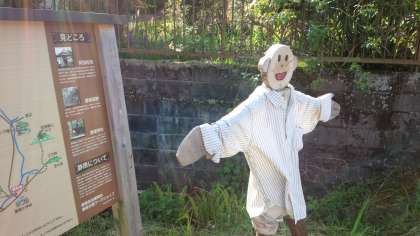 昨年子どもたちが間伐材を使って作ったかかしが学校のもわりに立っているのですが、学校の近所のお家でも楽しいかかし?を見つけました。
