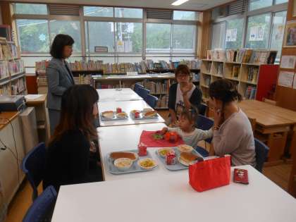 体育健康教育室より西川先生にお越しいただき、給食や食生活についてのお話をしていただきました。その後、いつも児童が食べている給食を試食しました。食材についても考えながら食べると味が変わってくるようです。