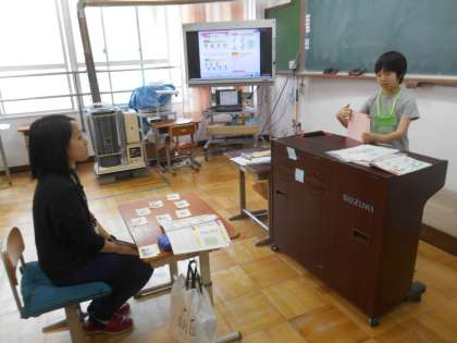 ALTの先生が来られる日です。ALTの先生とコミュニケーションをとろうとしています。普段の生活とは違う英語を使うということをきっかけとして、いろいろな話をしていこうとする時間です。