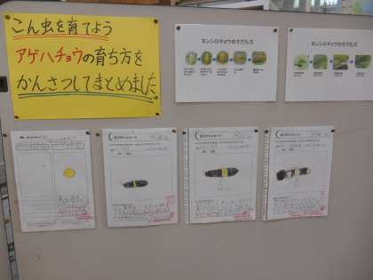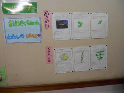 観察記録を自分の目で見てしっかり書いています。順番に掲示してあり、変化がよくわかります。次の予想や次の学習が児童にとって何をどうしていくのかもわかり、主体的に学習が進みます。