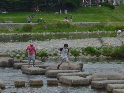 バスが来るのを待つ間に,鴨川で川の合流を見たり,飛び石で遊んだりしました。