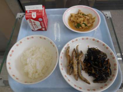 ごはん 牛乳 きつね丼(具) きびなごのからあげ ひじきの五目煮