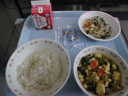 麦ごはん 牛乳 和風カレーどうふ もやしの煮びたし じゃこ