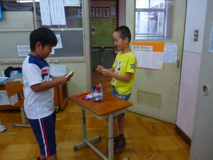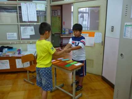 今日の英語活動の時間では,お店屋さんになり,これまでの学習を活かして,欲しい色のカードやペンを英語でたずねあい,自分の名前をローマ字を使ってカードに記入しました。繰り返し練習していることもあり,とても自信を持って英語活動の学習に向かえるようになりました。