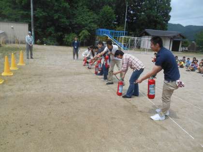火災の想定の時の避難訓練では、消火器訓練も実施しています。全校児童も教職員もいざという時に、消火器を有効に使えるように、訓練を実施しています。使った後の消火器の扱いについても学習しました。
