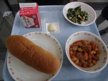 味つけコッペパン 牛乳 大豆と鶏肉のトマト煮 ツナとほうれん草のソテー チーズ