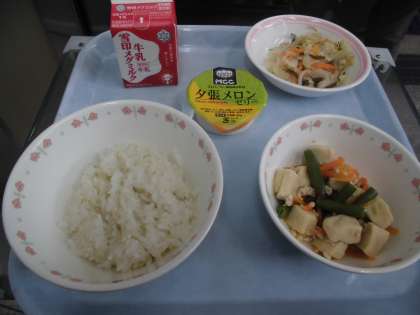 麦ごはん 牛乳 高野どうふのそぼろ煮 ごま酢煮 メロンゼリー