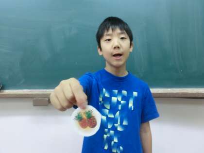 (今日の天気は?)の質問をし,「It’s sunny.」(晴れです)といった会話です。他にも「What do you like?」の質問で,「I like apple.」や「How are you?」で「I’m fine.」などです。質問と回答はお互いで交互に行っています。是非,ご家庭でもちょっとした会話の中に英語を取り入れてみて下さい。