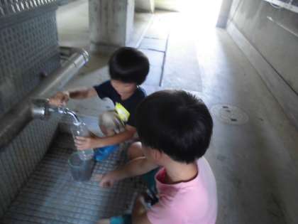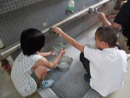 L(リットル)ますを使って,容器に入る水のかさを測定する学習をしています。実際に水の量を測ることで,L(リットル)やdL(デシリットル)といったかさの大きさの感覚を養うことを目的としています。