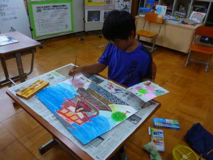 今,図工では「京都市を描こう」というタイトルで,自分が描きたい京都市の建物などを選び描いています。昨日,ようやく完成しました。描いたのは,「伏見桃山城」。集中してていねいに色を重ねながら素敵な作品が仕上がりました。