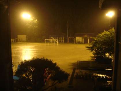 静原地域に大雨による土砂災害に対する避難勧告が出ています。18日午前0時現在、小学校では、自主防災会の方、自治会の方が避難所の準備をしてくださっています。運動場、体育館に照明をつけています。静原川の水位が高くなっています。夜間ですので避難される場合は、十分お気を付けておこしください。