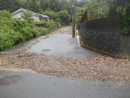 水が道路を流れ、地面をえぐったり、土砂を運んだり、大きな土砂災害にはなっていないようでしたが、道路には、水があふれた後がたくさんのこっています。