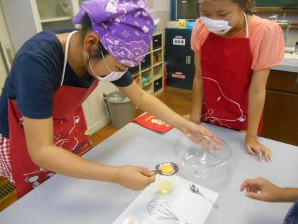 卵の黄身を使うので、セパレ—ターという道具で、黄身だけを取り出し、酢と塩を入れ、サラダ油を少し筒入れながら乳化ししていきます。だんだん、黄色い色が、マヨネーズのように白くクリームのようになっていきます。