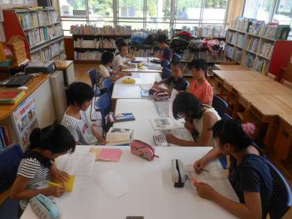 自学自習の時間です。夏休みの宿題の進捗情報の交流をしながら、自分の課題を進めています。