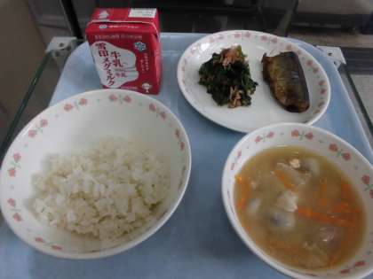 麦ごはん 牛乳 さんまのかわり煮 ほうれん草のおかか煮 豚汁