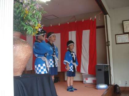 9月12日に静原社会福祉協議会主催の敬老会が行われました。そこでのプログラムの1つに例年子どもたちの発表を入れていただいています。子どもたちは全員であいさつした後、グループごとに踊りや演奏をしていきました。校歌の演奏もあり、会場の皆さんも懐かしい校歌を一緒に歌ってくださいました。
