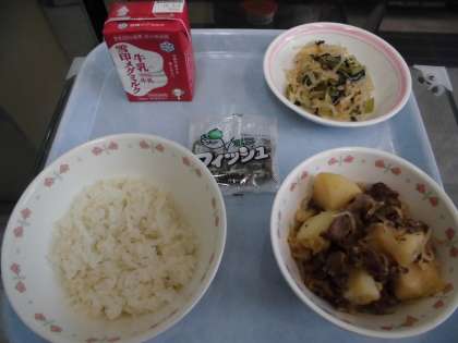 麦ごはん 牛乳 肉じゃが 小松菜と切干大根の煮びたし じゃこ