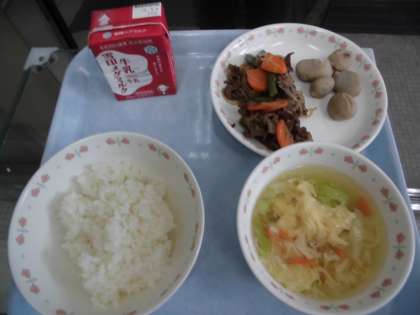 胚芽米ごはん 牛乳 牛肉のしぐれ煮 里いもの煮つけ キャベツのかきたま汁