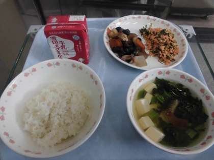 麦ごはん 牛乳 さけとだいこんの葉のまぜごはん(具) 黒豆の五目煮 とうふの吉野汁