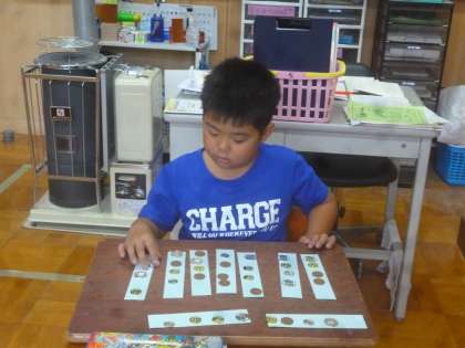 今日の算数の時間,「あまりを考えて計算しよう」というめあてで,あまりのあるわり算の文章問題を行いました。問題文から,立式をして,計算をし,答えを導き出した後に,たしかめの場を使い,具体物を使って計算があっているかの確認をしました。具体物を使うことで,商は〇,あまりは△,答えは◇という風に,より式の意味を感じられます。また,具体物を操作することで,自分の出した答えが正しいのかをたしかめ,違いに気づくことができました。また,文章をを黒板に書き,話す順番を考えて,式の意味を発表する時間もとりました。1時間の学習の中にも,いろいろな活動を取り入れながら,いろんな角度から児童の学びを支えていきたいと思います。