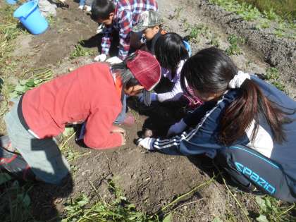 収穫の秋です。大きなイモが出てくると。興奮した声が聞こえます。いもを傷つけないように気をつけて掘りました。