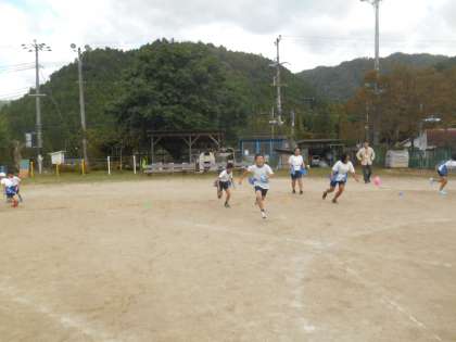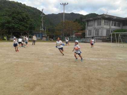 ボールをもってフラッグをとられないように逃げました。ボールを持っている人のフラッグ(腰の横につけたもの)をとるように走りました。道具の寄贈があり、楽しく体を動かすことに活用できました。