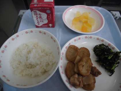 麦ごはん 牛乳 平天とこんにゃくの煮つけ ほうれん草とじゃこのいためもの フルーツ寒天