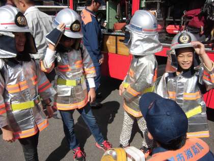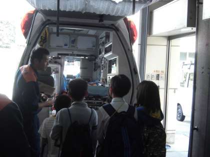 校外学習が続いています。今週は、北消防署に行ってきました。京都市の消防のしくみや消防署内で働いている様子、救急車や消防車のつくりなど1時間半の見学の中でたくさんのことを教えていただきました。
