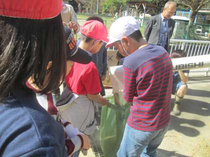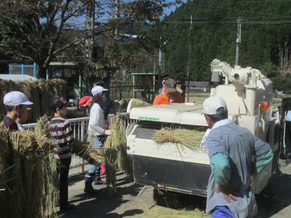 手作業でできなかった分は,コンバインで脱穀をしていただきました。もみがきれいに取られてきれいになったわらが出てくる光景にみんな見入っていました。
