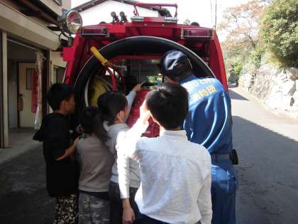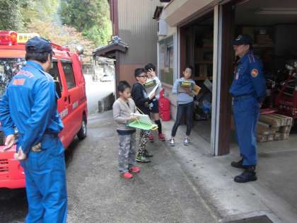 地域では、どのようにして火事などの災害から生活を守っているのかを調べるために、静原消防団の方たちにお話を聞きに行きました。自分たちが知らないところでいろいろなお仕事をしていることがわかりました。
