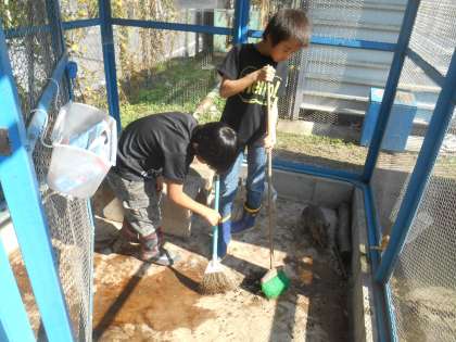 うさぎ当番、掃除をがんばっていました。ウサギも人が入ってくると、気になってウロウロします。