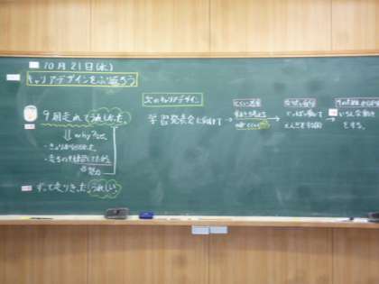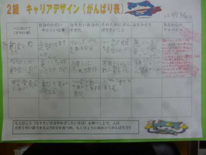 今日の1時間目に昨日のなかよし運動会でのキャリアデザインをふりかえりました。昨日目標だった,「持久走で8周以上走る」を更新しできたことがうれしかったようで,「練習をがんばって9周走れてうれしかった」というふりかえりをしていました。努力が成功につながるということを実感できたようです。そして,次のキャリアデザインとして,学習発表会に向けて「動きを入れるのが得意」なので,「いっぱい動いて演技をする自分」になりたい。そうなるために,「いろんな動きをする」というキャリアデザインを考えました。学習発表会で,たくさん動いてがんばっている姿を見てもらえるよう一緒に練習をがんばりたいと思います。