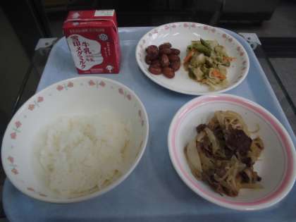 ごはん 牛乳 牛丼(具) 金時豆の甘煮 アスパラガスのごま煮