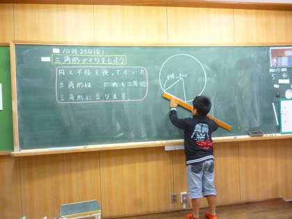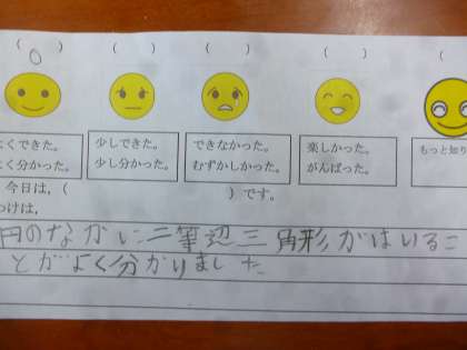 今日の4時間目に算数で,円の半径を作って二等辺三角形と正三角形を作図しました。いつも算数の時間には,問題文をノートに写しているのですが,書くスピードが速くなってきました。今日のふりかえりでは,「円の中に三角形ができるということが分かりました」というように,分かったことを具体的にかけるようになってきました。いろんな学習でのふりかえりを書くことの積み重ねにより,今日のふりかえりができるようになったと成長を感じました。