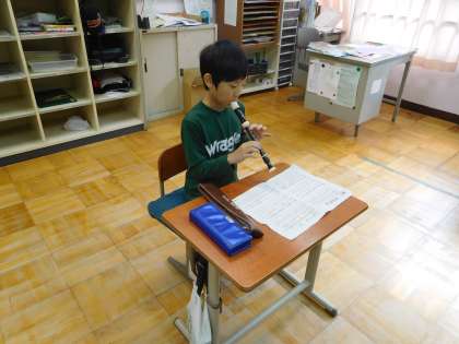 学習発表会で演奏する5・6年生の合奏で,5年生はリコーダーと大太鼓・小太鼓を演奏します。全員で合わせての練習には時間の限りがありますが,休み時間などを利用して自分練習に励んでいます。