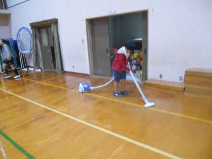 バレーボールのために、床の清掃をしています。やり方が分かり、すべらない床の準備を進めています。
